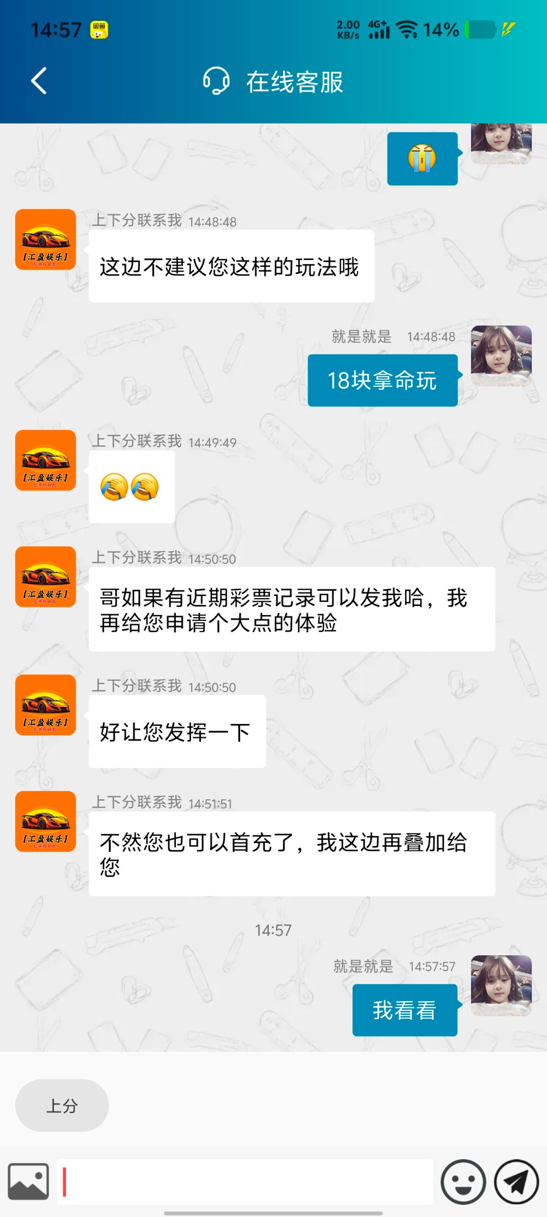 每次充个一百上到一千然后就怕死不敢再玩下去了,这是什么心理??难怪赢不了大钱啊