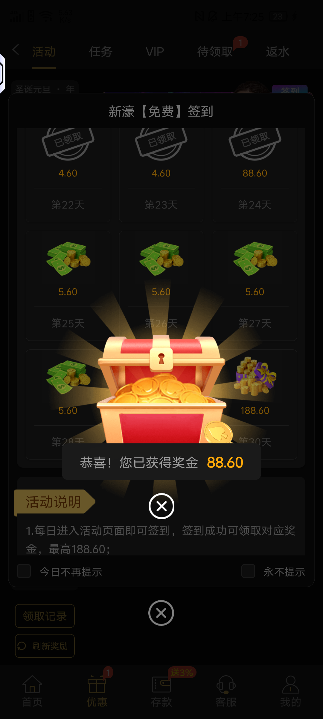 一个月以前发过帖,特邀免费签到,今天签到了,25天了,领了88,但就是一直没有水,从来没有提现过,签到没有门槛,这个是特邀给的,有号的自行上去看看是不是有特邀门槛,出款自测!
