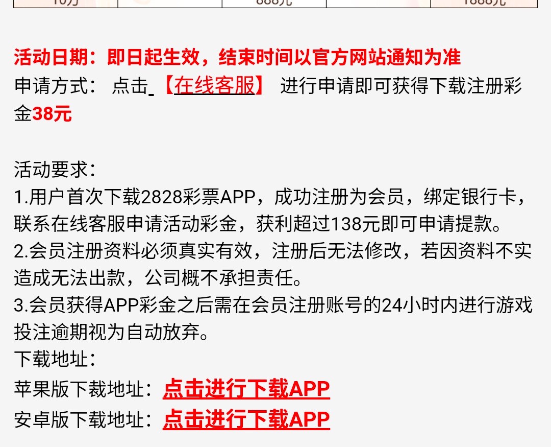 下载手机APP注册完善资料后 点击 在线客服 进行申请即可获得下载注册彩金38元 彩金盈利满138元 即可提现