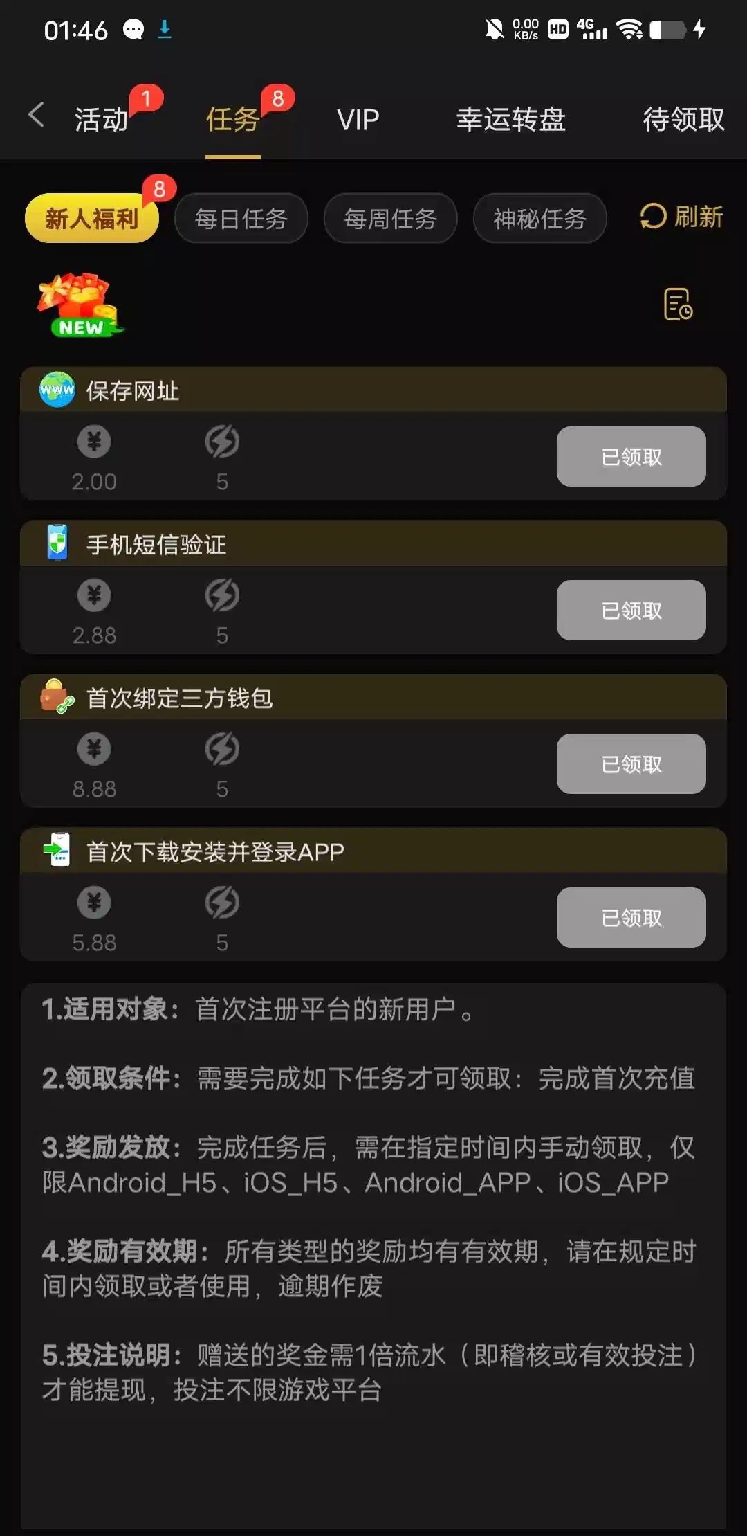 暂时不黑任务彩金要第二天才能领取,自己看 789.vip