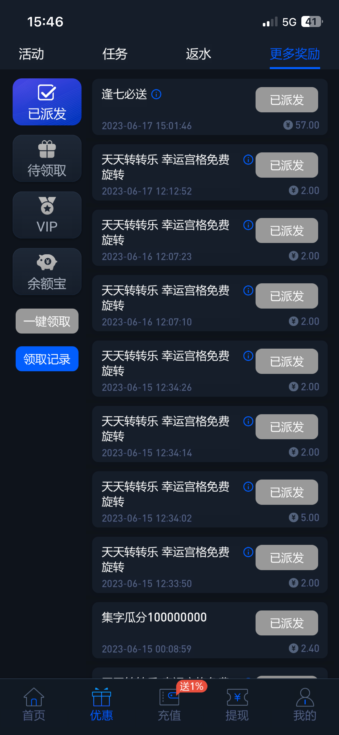之前充了几百,没有回馈金。