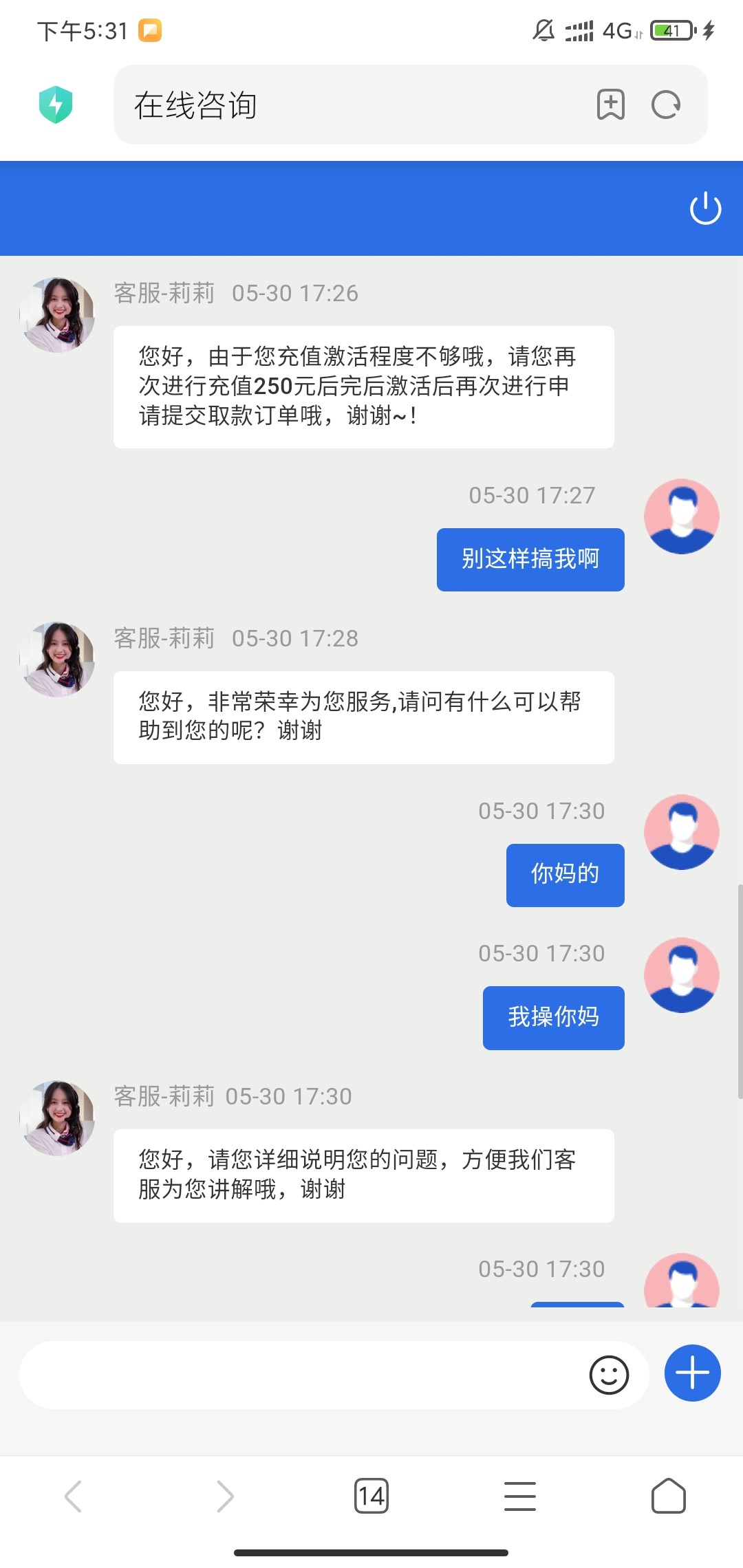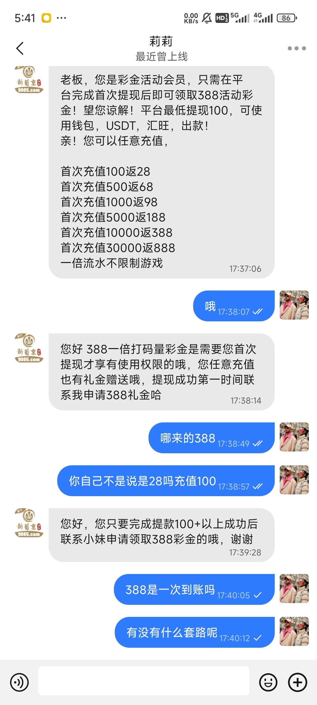 我都不知道你想什么,又打电话又下app又下聊天app最后还得充值送的狗台子,你真想去充值?