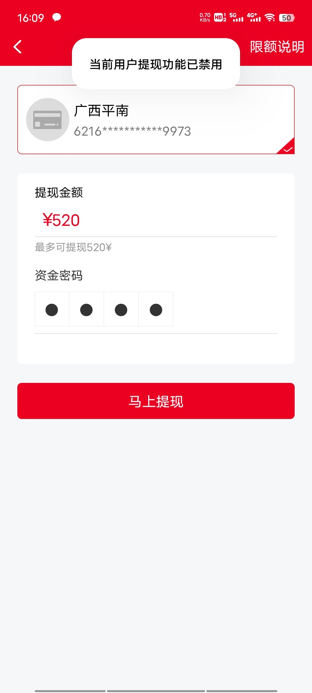停在510,提现失败并扣除,黑了500,退还10块