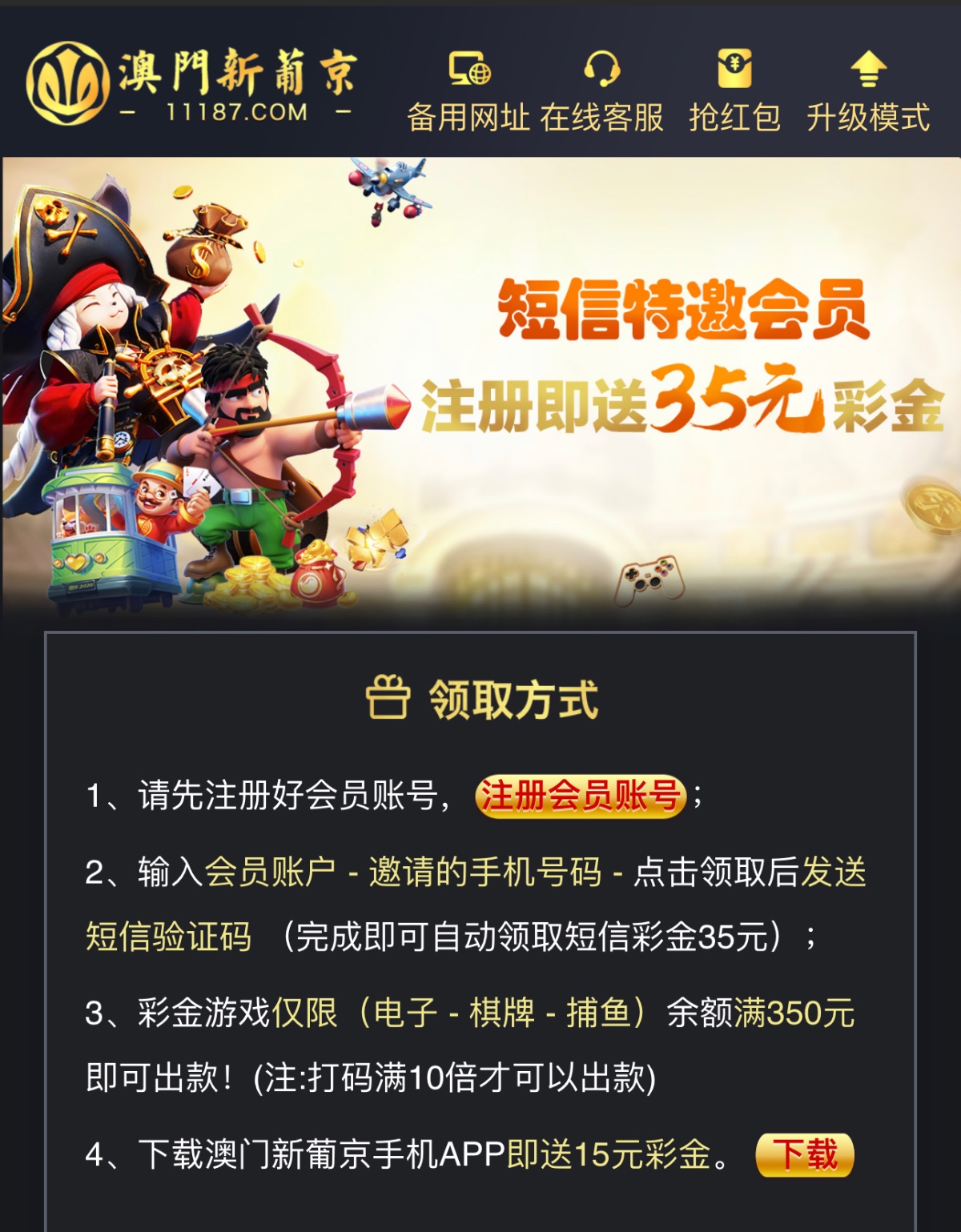 新用户注册绑卡 再返回网站申请35元彩金 特邀碰瓷 都去试试 限制游玩电子捕鱼棋牌 10倍流水 最低提款350元