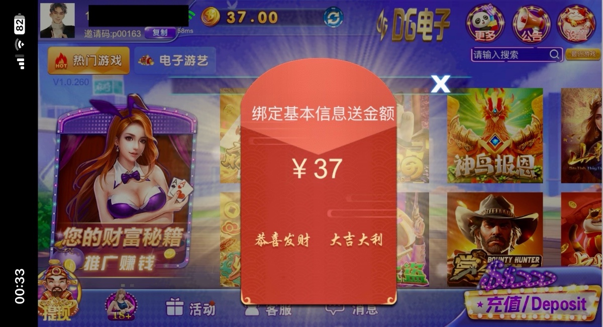 手机号注册,注册秒送37彩金,没有就是黄了,打到300提现,出款自测
