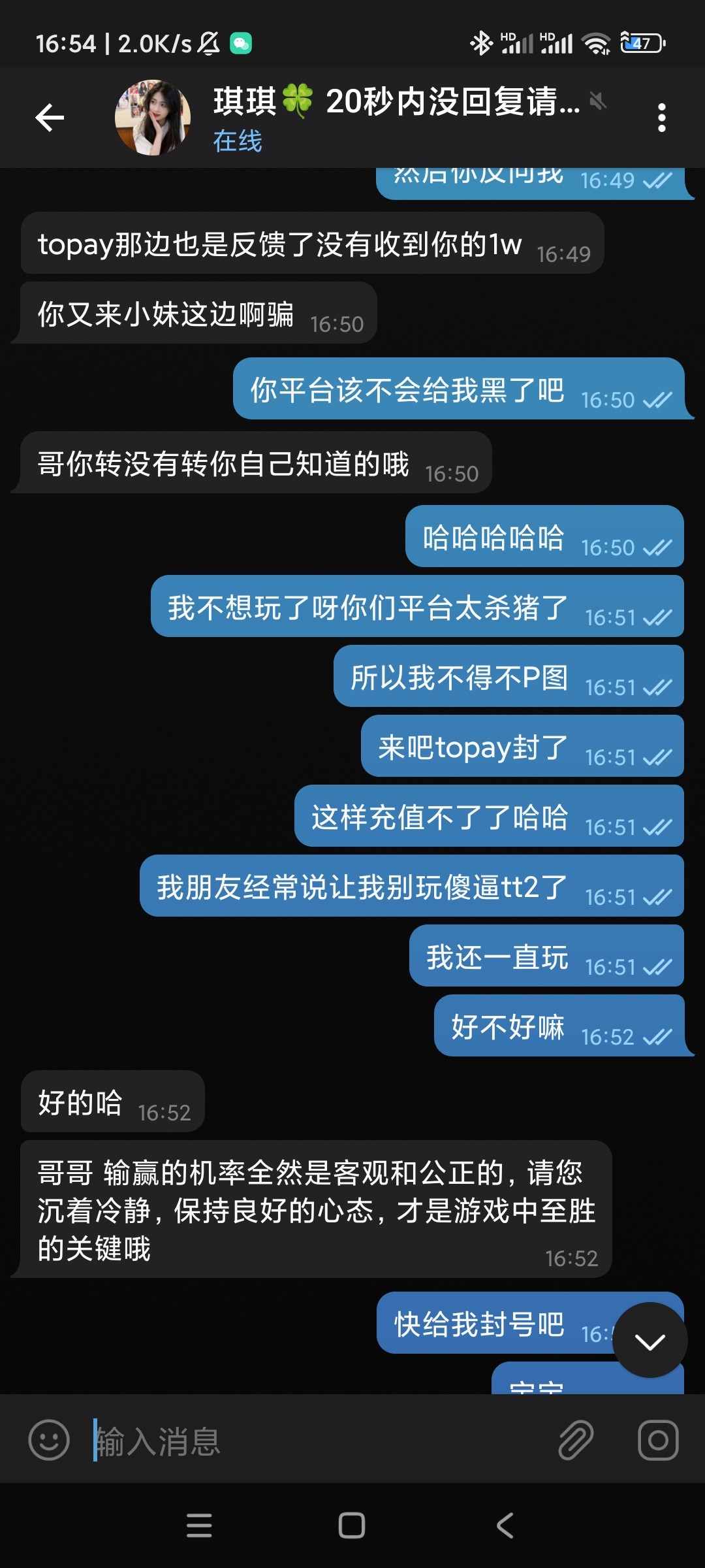 哈哈兄弟们   我走了   不玩了  不给tt2傻逼平台送了  去年4月份到现在充值了10.7个   之前pop客服说我说我要报警都不给我封号了  今天好了  我所有钱包  就剩一个topay了  上了1万p图   秒封然后tt2平台账号禁用了   pop也封了   兄弟们有玩tt2的别玩了  真他妈垃圾   过年过节.什么福利彩金都没有  就要充值才有1000才38    垃圾   我都不知道为什么  我玩了一年  垃圾瓦力棋牌红黑大战   杀的我怀疑人生   现在好了  我自己要强制了  愿所有好哥哥迷途知返吧     是我自己要强制下线自己的   我知道top图秒死   我就想让自己断了充值的通道  银行卡也没有了   现在舒服了