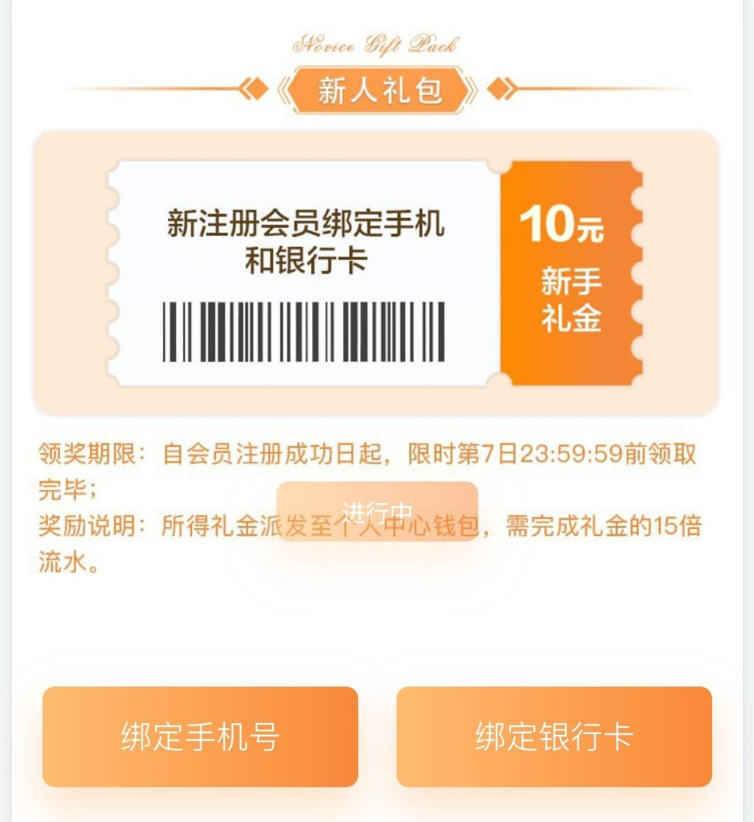 新用户注册绑定手机号绑卡,优惠活动里新手任务领取秒10,15倍流水提现。