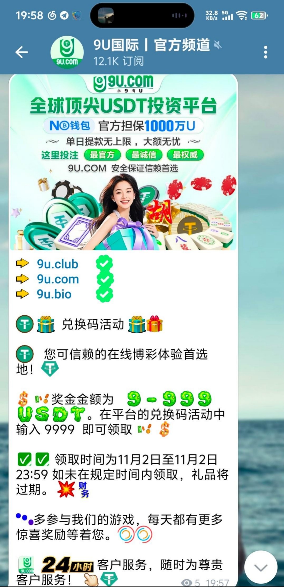 兑换码9999,今天23.59结束,兑换码在频道发应该是通用的,没看见写提现要充值 9u.com