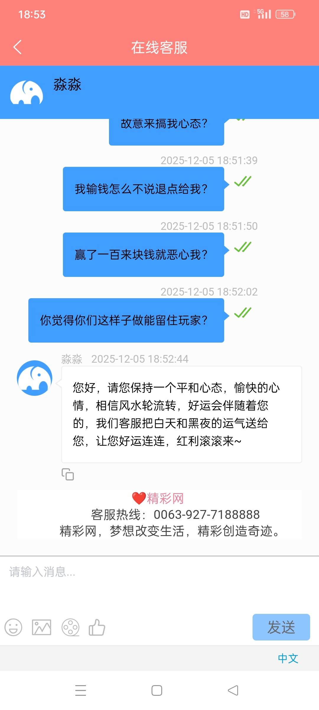 前段时间朋友玩668赢了2w多,我玩前前后后输了两千左右,因为没赢过钱,所以不充了,然后这段时间时不时抢一下红包看看能不能打起来,看到老哥打起来的也有好多,非常羡慕,我刚好抢了2块红包,然后打了半天一直在爆,爆了100准备提现,结果拒绝提现,罚水5倍打码,操他妈的668全家的大逼,死娘胎里面变畸形儿,不得好死的狗东西,退回来之后,一直杀一直杀,不像之前那么给了,然后输完了,就是搞心态,有点意思,668,精彩网,大家记住了,黑台,pg电子全部空转,充了就死,上次充了500,有一次,记得清清楚楚,连550都没有上过,一个免费没有,直接吃完,你妈逼你是饿了多少天啊?吃像这么难看?一点不吐?你说我赢钱倒是无所谓,你吃就吃了,我能接受,老子输钱故意搞我一个人?你怎么不去搞我朋友,草死你妈了的垃圾平台668精彩网,切记,黑台!