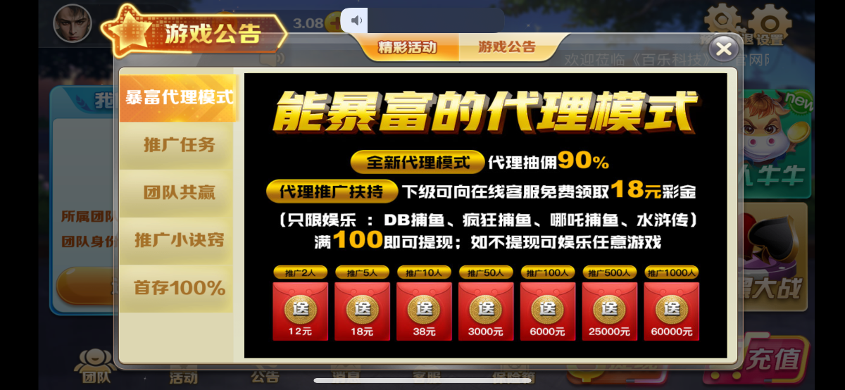 新用户下载注册完善资料联系客服申请18,限制捕鱼电子游戏,最低100提现。
